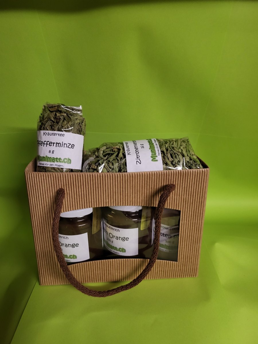 Das Täschen hat in der Breite Platz für zwei Gläser à 200 Gramm. In der Höhe hat es noch Platz für Tee oder Kräuter.
